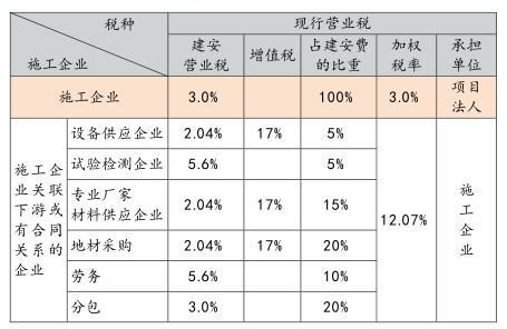 從對比分析可知,在現(xiàn)行營業(yè)稅和一般項目執(zhí)行結(jié)構(gòu)比例的情況下,施工企業(yè)須多承擔(dān)12.07%的稅金,如果施工企業(yè)不分包、也不雇傭勞務(wù)、不委托試驗檢測即外委工程越少,以稅金方式支出的成本會變低,但維護(hù)和保持施工能力的費用會高于以稅金方式支出的成本。這是當(dāng)前施工企業(yè)為什么只做項目技術(shù)管理工作,多采用專業(yè)分包方式實施項目建設(shè)的原因。營改增后,施工企業(yè)稅負(fù)如下表所示: